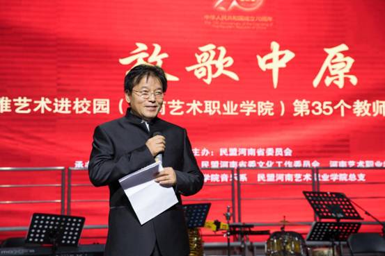 省政协常委、民盟河南省委专职副主委柳锋波代表民盟河南省委讲话。他指出,教育是传承过去、造就现在、开创未来,推动人类文明进步的重要力量,是改变贫困地区落后面貌,创造美好生活的根本途径。河南艺术职业学院作为我省艺术工作者的重要培养基地,建校以来,坚持追求卓越,自强不息,培育了一大批优秀的艺术人才,为弘扬华夏文明、传承中原文化、光大艺术事业发挥了积极的作用。民盟作为以文化、教育、科技为主体界别的参政党,奔走国事,关注民生,是民盟的优良传统。传播正能量,弘扬主旋律是当今时代赋予的历史使命。他希望通过本次活动,传承中华优秀文化,为营造中原人民温馨和谐的精神家园贡献力量,以实际行动为中华人民共和国成立70周年献礼!