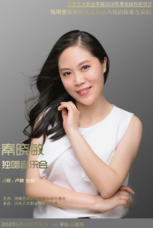 6月14日下午,河南艺术职业学院2018年度校级科研项目《独唱音乐会形式及作品风格的探索与实践——秦晓敏独唱音乐会》在我院小剧场拉开帷幕,一曲曲饱含深情的歌曲,为现场数百名观众带来一场丰富的民族声乐盛宴。著名曲艺表演艺术家、中国曲艺家协会副主席、河南省文联副主席、河南省曲艺家协会主席范军,著名作曲家、河南省音乐家协会主席周虹,河南省音乐家协会秘书长郭志华,河南省曲艺家协会副主席李广宇,河南省文化厅艺术处副处长解冬,河南省教育厅社科处调研员魏军等嘉宾应邀来到音乐会现场观看演出并给予了高度评价。河南艺术职业学院党委书记普锋等领导及师生观看了音乐会。