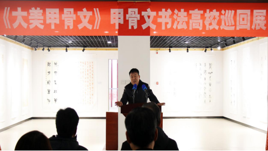 河南艺术职业学院校长周宝全在开幕式致辞。他讲到:甲骨文,出土于安阳殷墟,是迄今为止中国发现的年代最早的成熟文字系统,是汉字的源头,是千年中华文明的标志,甲骨文书法对于我们增强文化自信、推进文化艺术事业大发展、大繁荣具有非常重要的意义。此次展出的作品集中体现了甲骨书法艺术发展的最新成果,反映了甲骨文这一古老文明对我们华夏文化的影响力。甲骨文书法艺术作品使我们感受到甲骨文的线条之美、章法之美和形式之美,同时展出的一幅幅别开生面的甲骨文书法让我们感受到古老的甲骨文在新时代散发的独特魅力。
