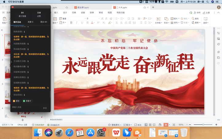 开展党的二十大精神进课堂活动,有效提升了我校大学生的思想认识和政治素养。学生们纷纷表示,将认真学习领会党的二十大精神,感悟思想伟力、坚定理想信念、凝聚奋斗力量,在新的征程上书写精彩人生。