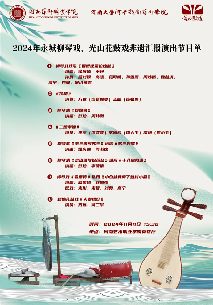 鼓声琴韵,承梦传情。2024年11月11日下午,中国非物质文化遗产人群研培计划(光山花鼓戏、永城柳琴戏)汇报展演在我校荷花剧场圆满落下帷幕