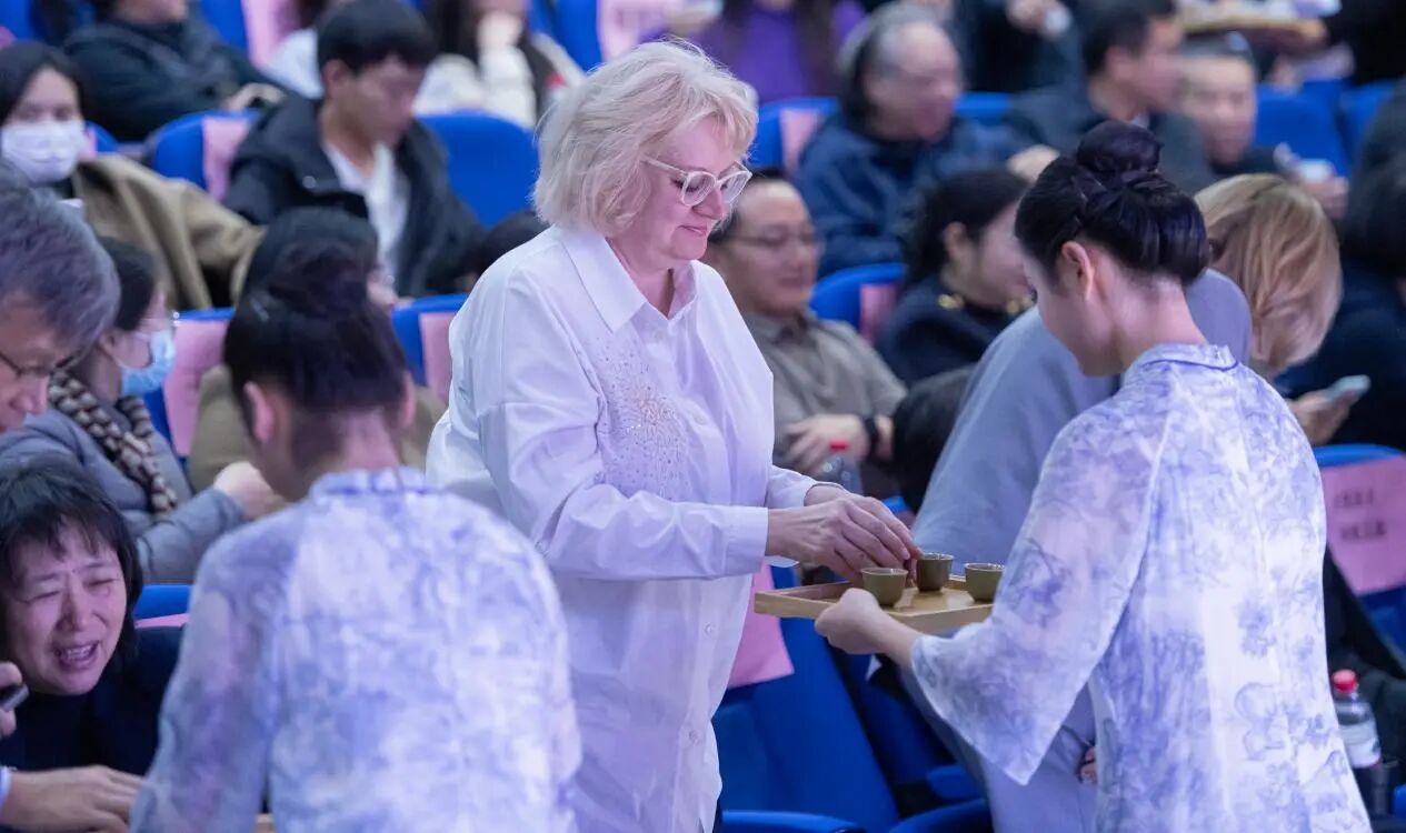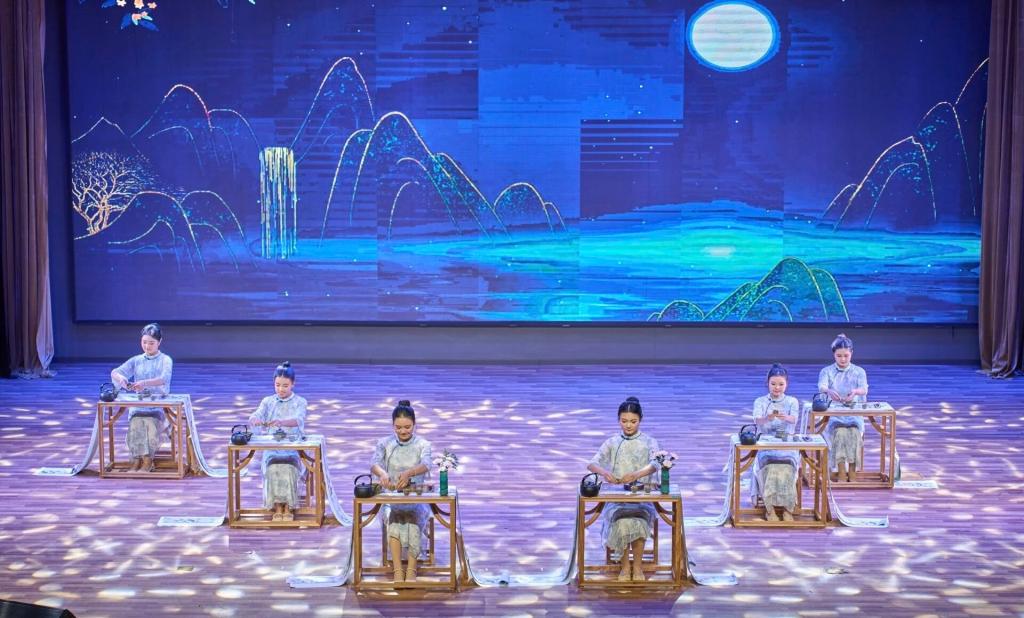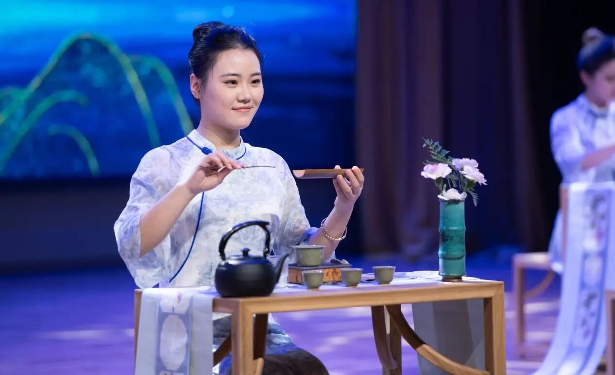 传媒学院的茶艺展演通过沉浸式舞台呈现,让观众在氤氲茶香中感受中国传统文化之美。